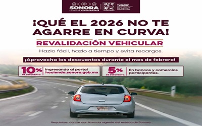 La Secretaría de Hacienda del Gobierno de Sonora informó que durante el mes de febrero continúan vigentes los incentivos por pronto pago de la revalidación vehicular 2026, como parte de las acciones para facilitar el cumplimiento oportuno de las obligaciones fiscales.