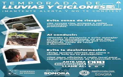 El Gobierno de Sonora, a través de la Coordinación Estatal de Protección Civil (CEPC), informó que, con base en el análisis de información meteorológica general y datos del Servicio Meteorológico Nacional, así como de diversas fuentes oficiales de los Estados Unidos, se emite el pronóstico de lluvias fuertes con puntuales muy fuertes (5 a 75 milímetros) para este lunes en las regiones sur y oriente del estado, debido a la influencia del monzón mexicano.